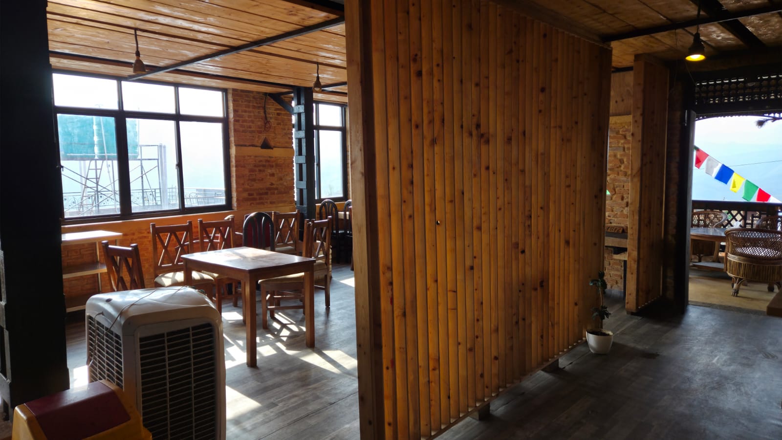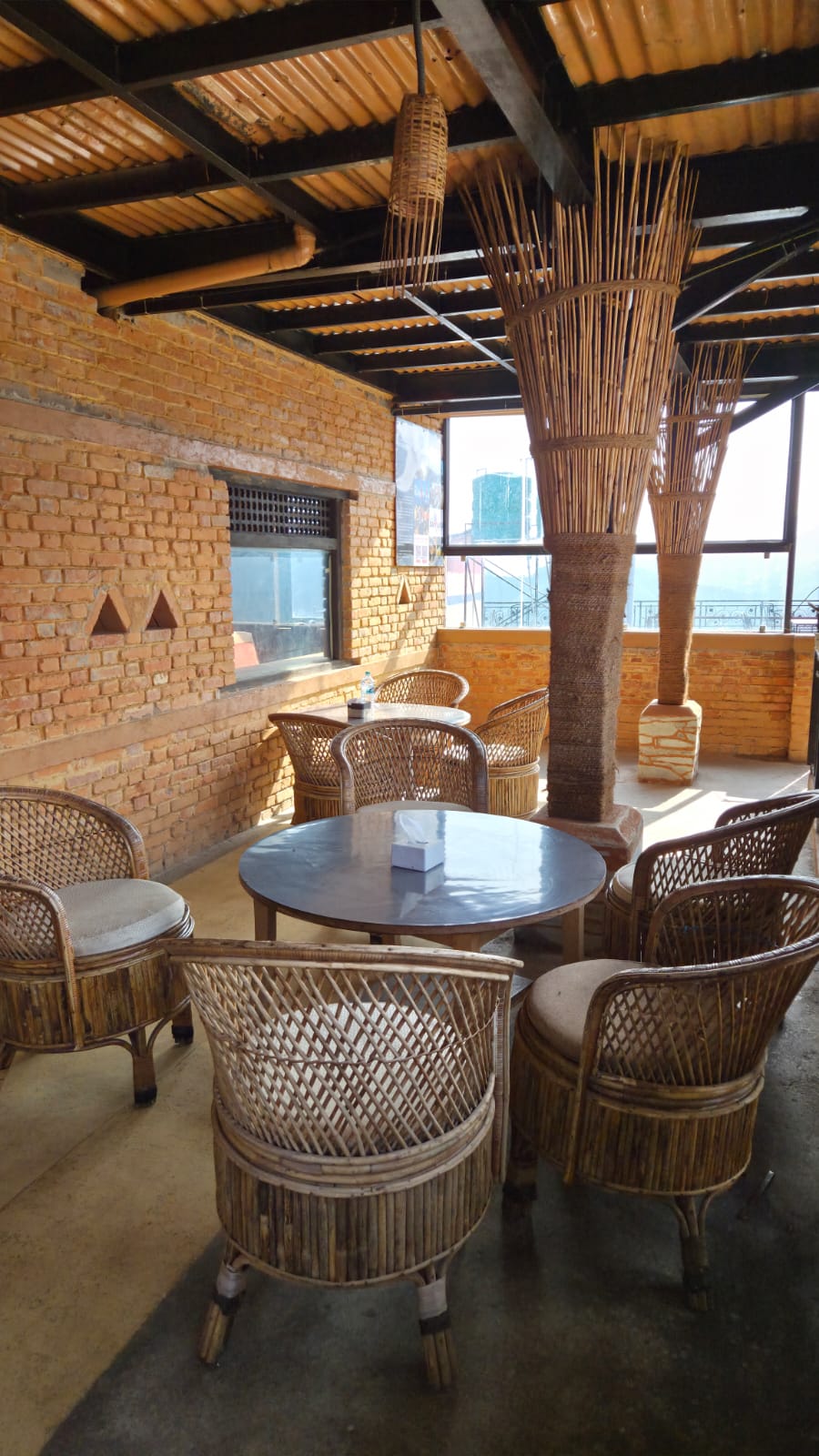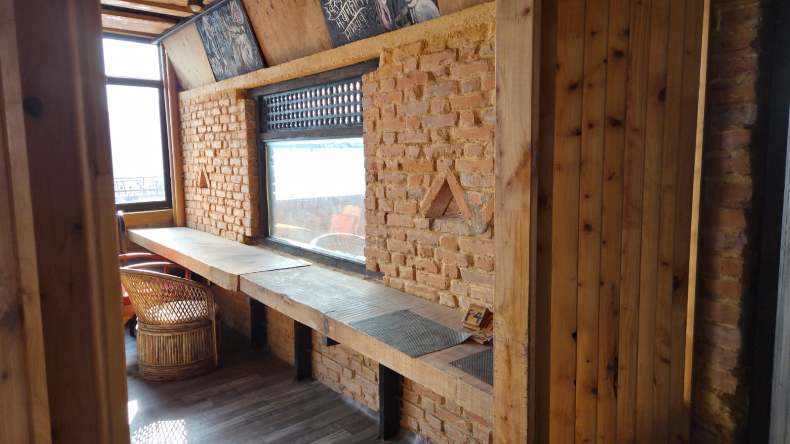 A scenic restaurant space fully executed by KoreArch—from structural work to interiors—featuring exposed brick, bamboo, and pine wood finishes with top-notch craftsmanship